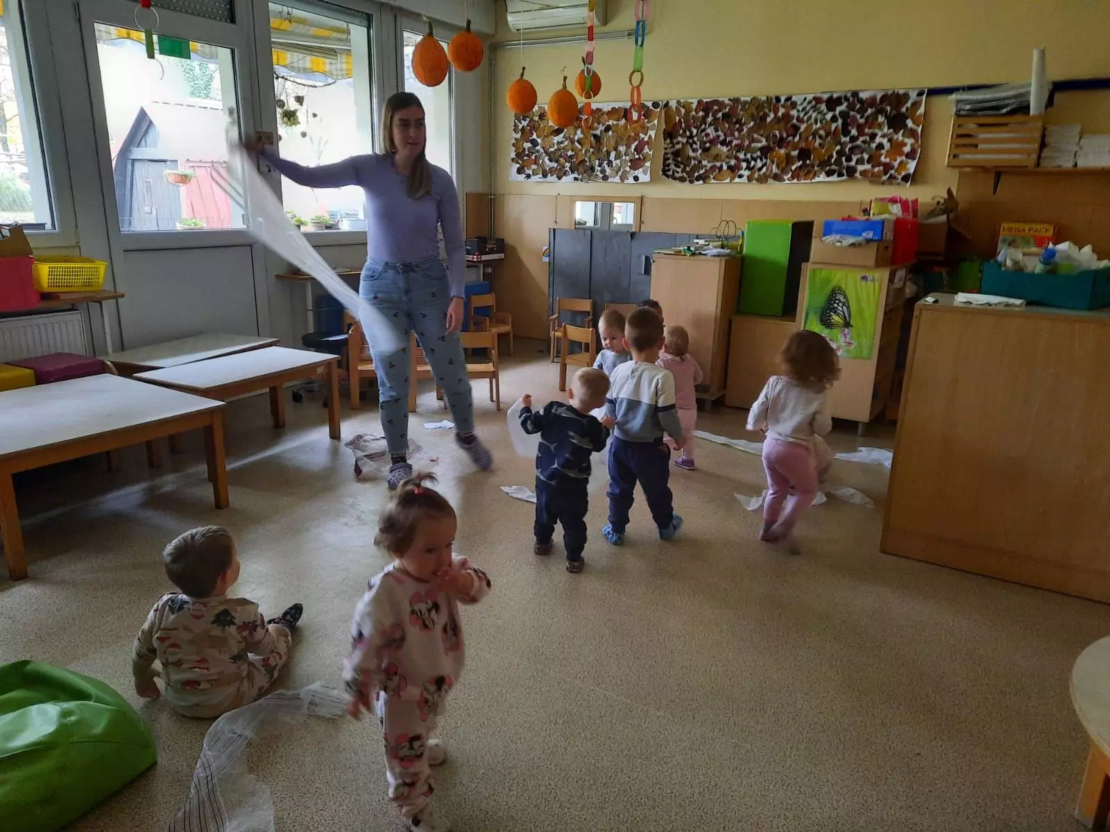 Kreativno smo se gibali in plesali (»kot listki v vetru«) z rekviziti - ruticami ob klasični sproščujoči glasbi Mojce Leban."