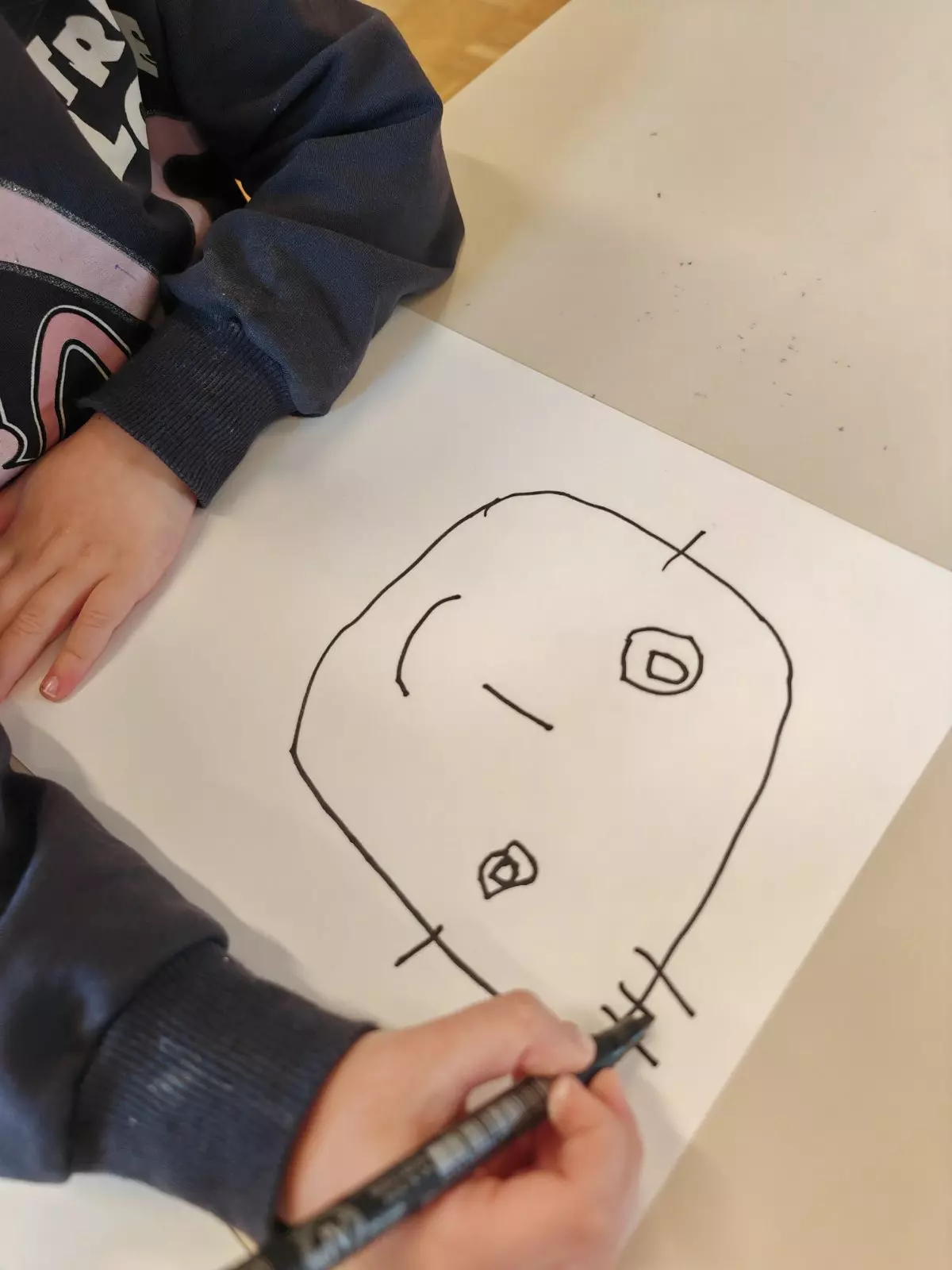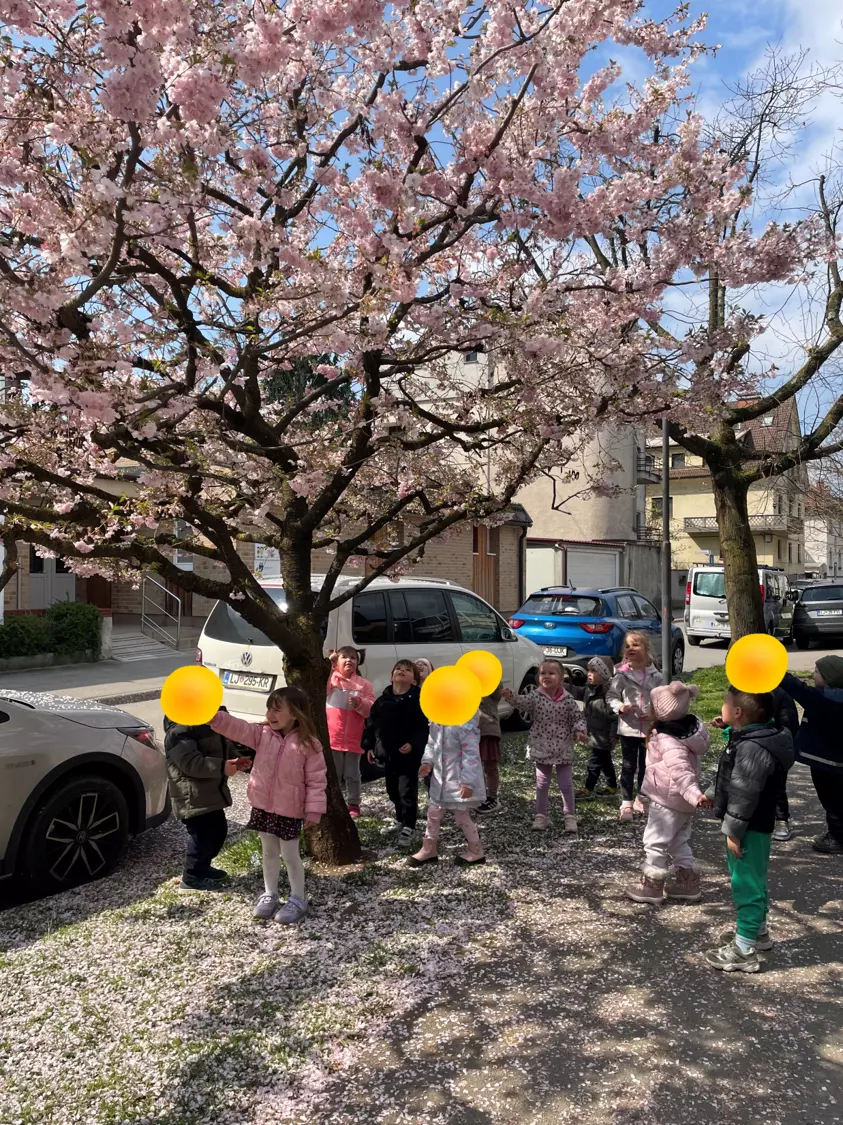 Na igrišču smo iskali presenečenja, ki nam jih je prinesla pomlad. Opazovali smo cvetoča drevesa pred vrtcem. Ustvrjali smo prstnne odtise v obeskih za mamice in mamice tudi narisali.