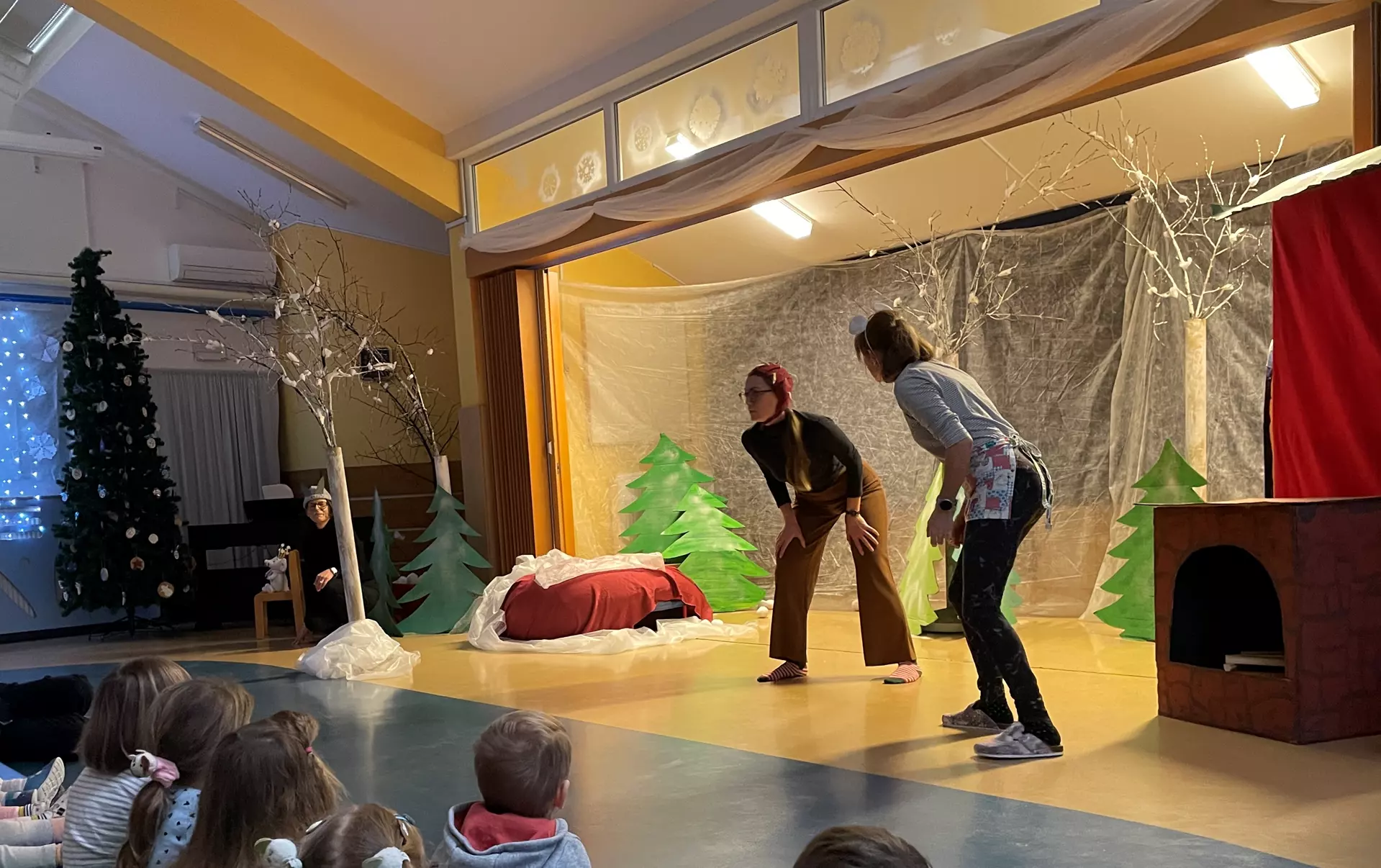si ogledali prirejeno predstavo Čakamo dedka Mraza (S. Makarovič) v izvedbi pedagoških delavk vrtca, po predstavi prižig prazničnih luči na smrečici in pripevanje otroških zimskih pesmi,